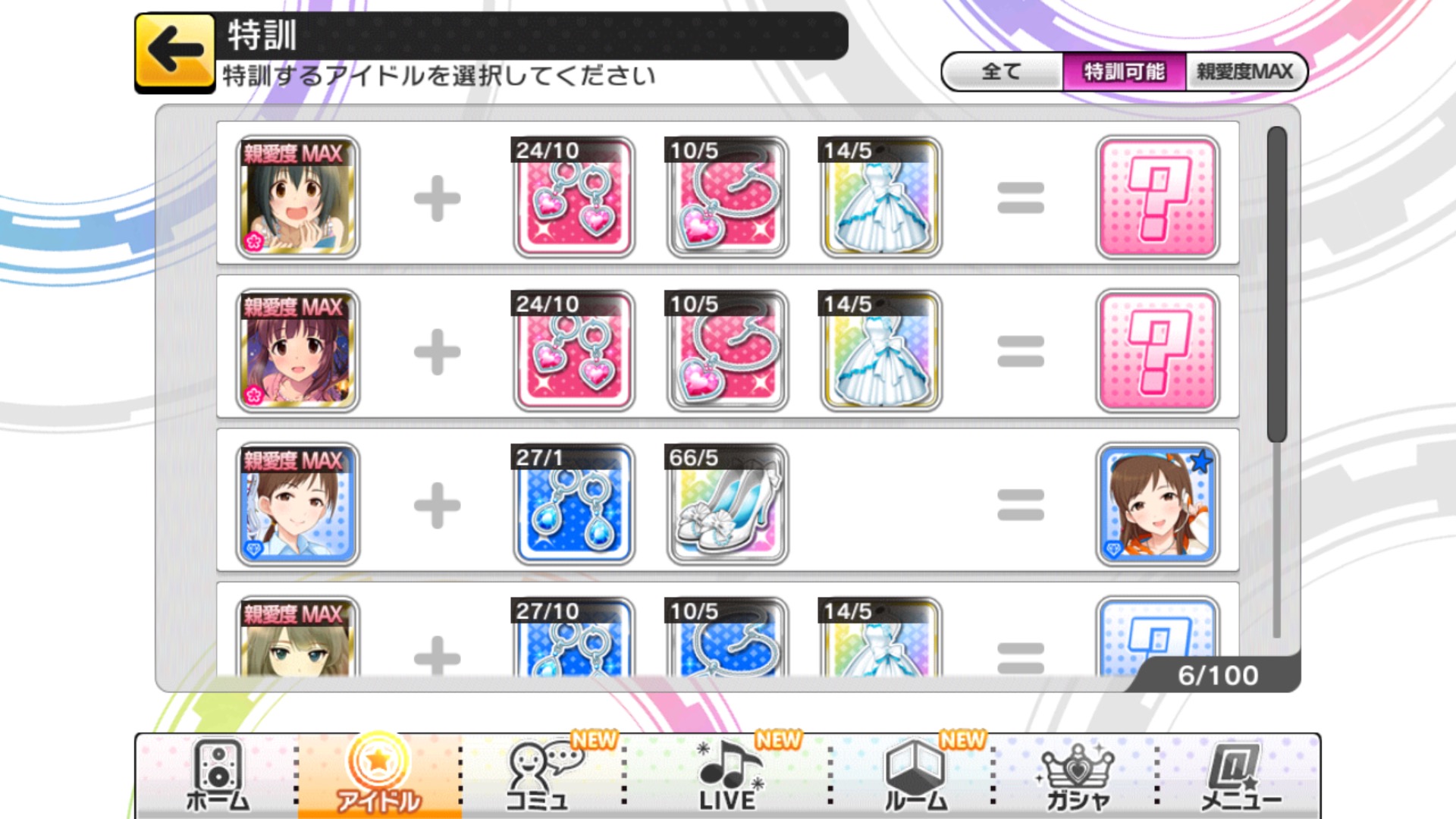 アイドルを特訓しよう アイドルの「親愛度」が max になると、アイドルを 「特訓」 することができます。 「特訓」 ボタンをタップして、特訓したいアイドルを選びましょう! アイドルを 「特訓」 するには、 「特訓アイテム」 が必要です。